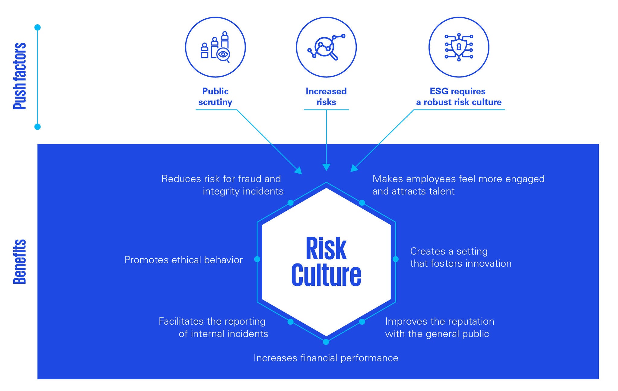 Moreover, organizations are facing numerous ‘push factors’ in today’s dynamic and fast-paced environment, such as growing pressures from governance, reporting, regulatory scrutiny, economic uncertainties, and the ongoing transformation driven by digitalization and automation. A robust risk culture helps organizations navigate these challenges, positioning them for long-term success. The benefits of a robust risk culture include: