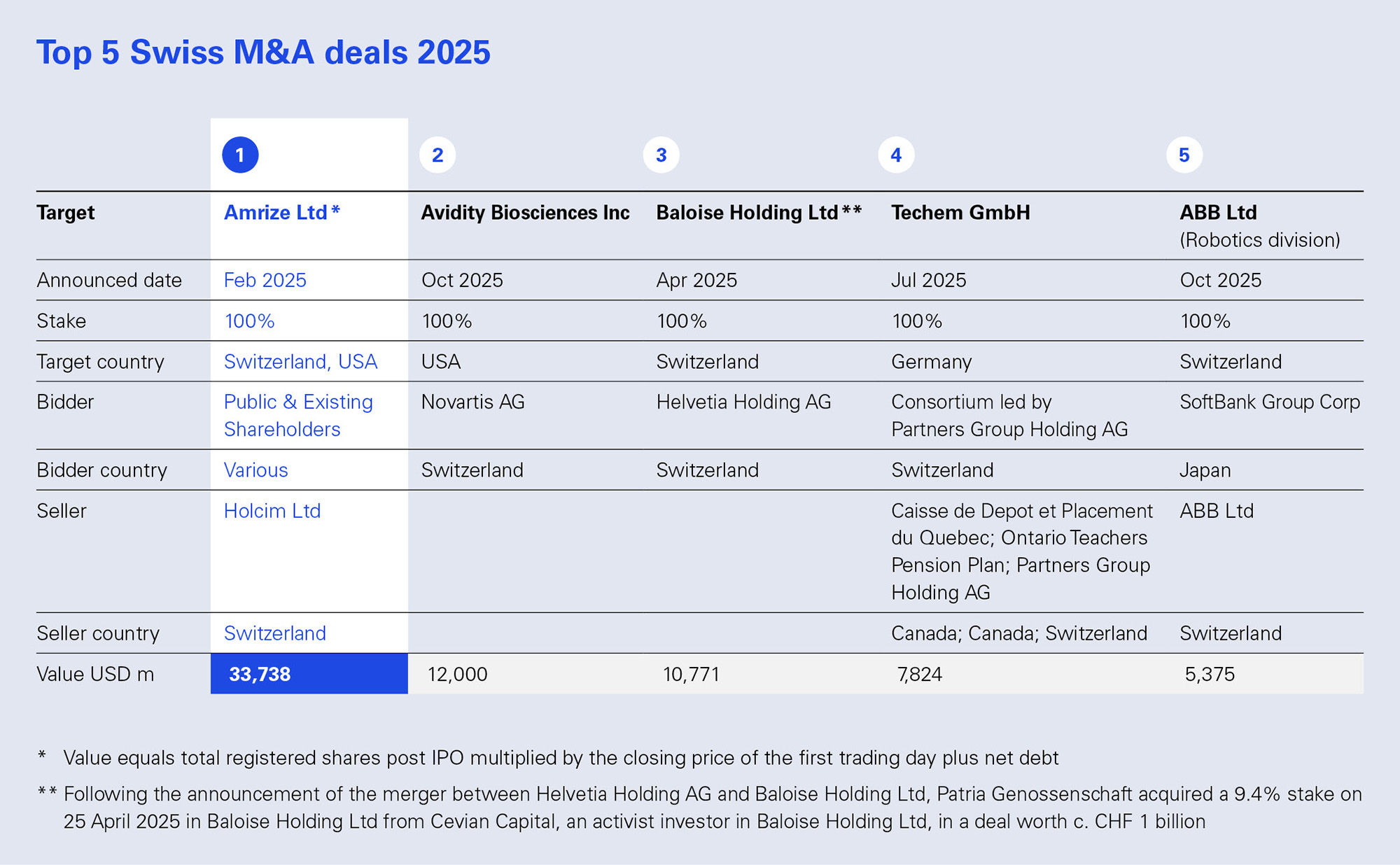 - Le spin-off d’Amrize Ltd. par Holcim Ltd. pour un montant de USD 33,7 milliards a constitué la plus grosse transaction.