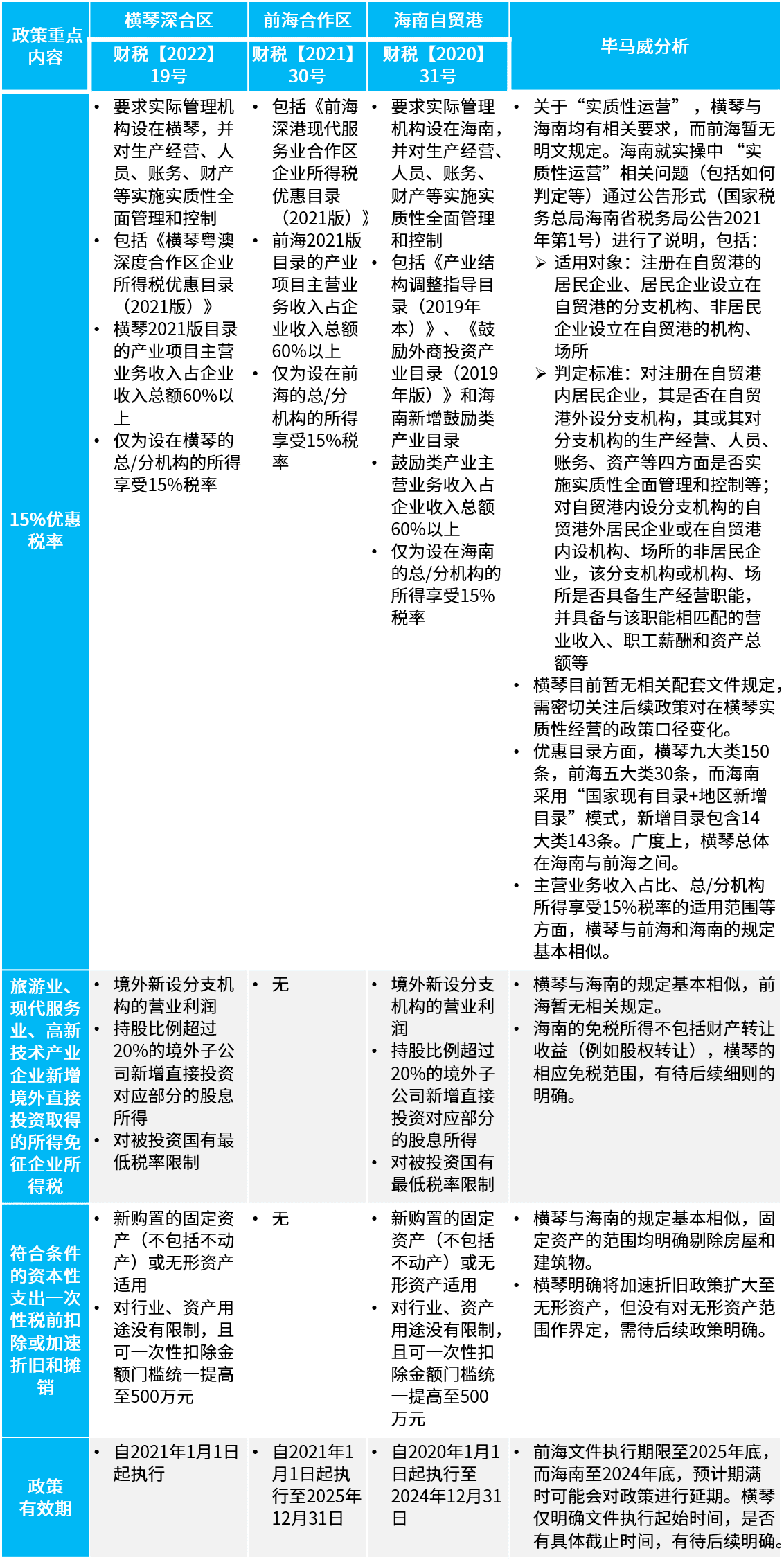 在与国家财税部门对前海合作区最新企业所得税优惠政策(财税【2021】30号)以及海南自贸港最新企业所得税优惠政策(财税【2020】31号)的比较中,毕马威的主要观察如下: