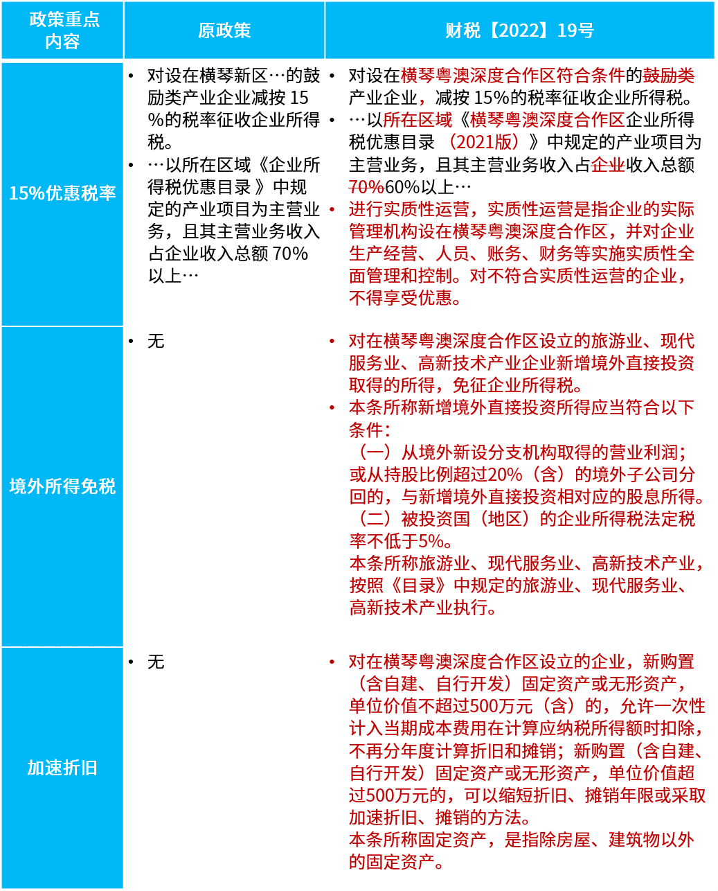 2021年9月5日,中共中央、国务院发布了关于《横琴粤澳深度合作区建设总体方案》(以下简称“总体方案”),提出将以更加有力的开放举措统筹推进粤澳深度合作,推动澳门经济适度多元发展。日前,由财政部、税务总局出台的《关于横琴粤澳深度合作区企业所得税优惠政策的通知》(以下简称“新政策”或“财税【2022】19号”),以《总体方案》为指导思想,进一步细化横琴深合区有关企业所得税优惠政策的具体规定。我们聚焦上述新政策,与大家分享相关重要信息,同时也将持续跟进后续相关配套政策的最新动向。