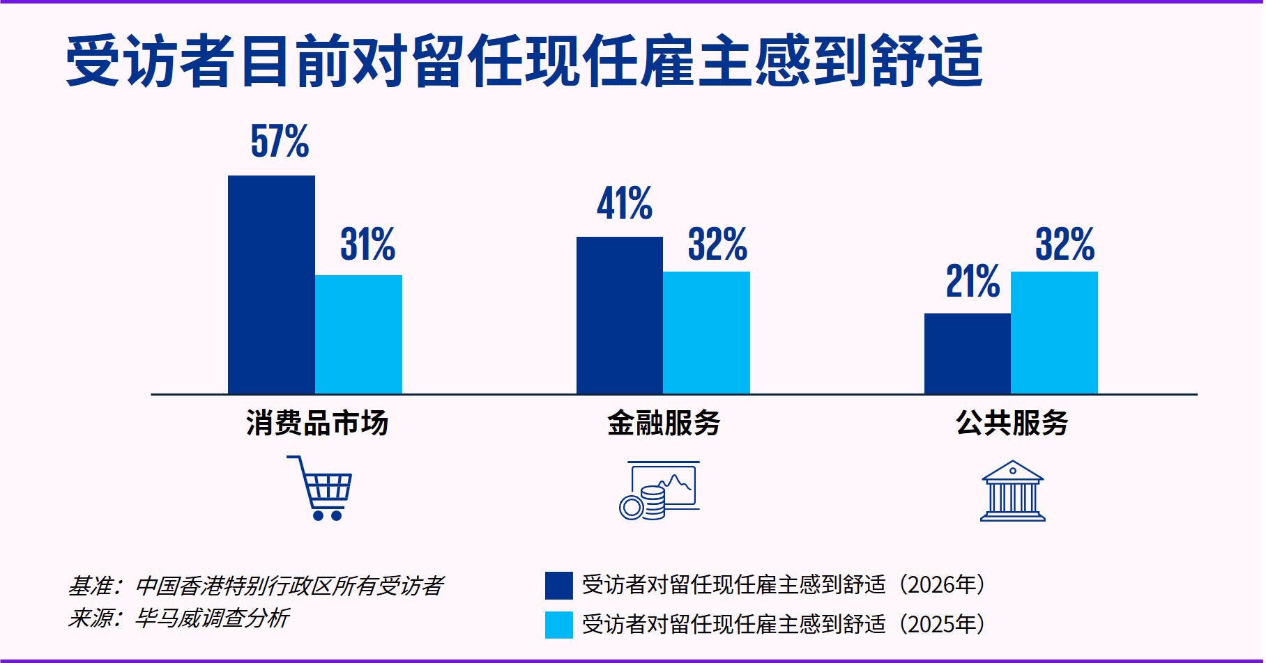 总体来看,36%的受访者表示愿意继续为现任雇主工作。消费品市场和金融服务的员工留任的意愿均有上升,分别为57%和41%;而公共服务的留任意愿则有所下降,为21%。