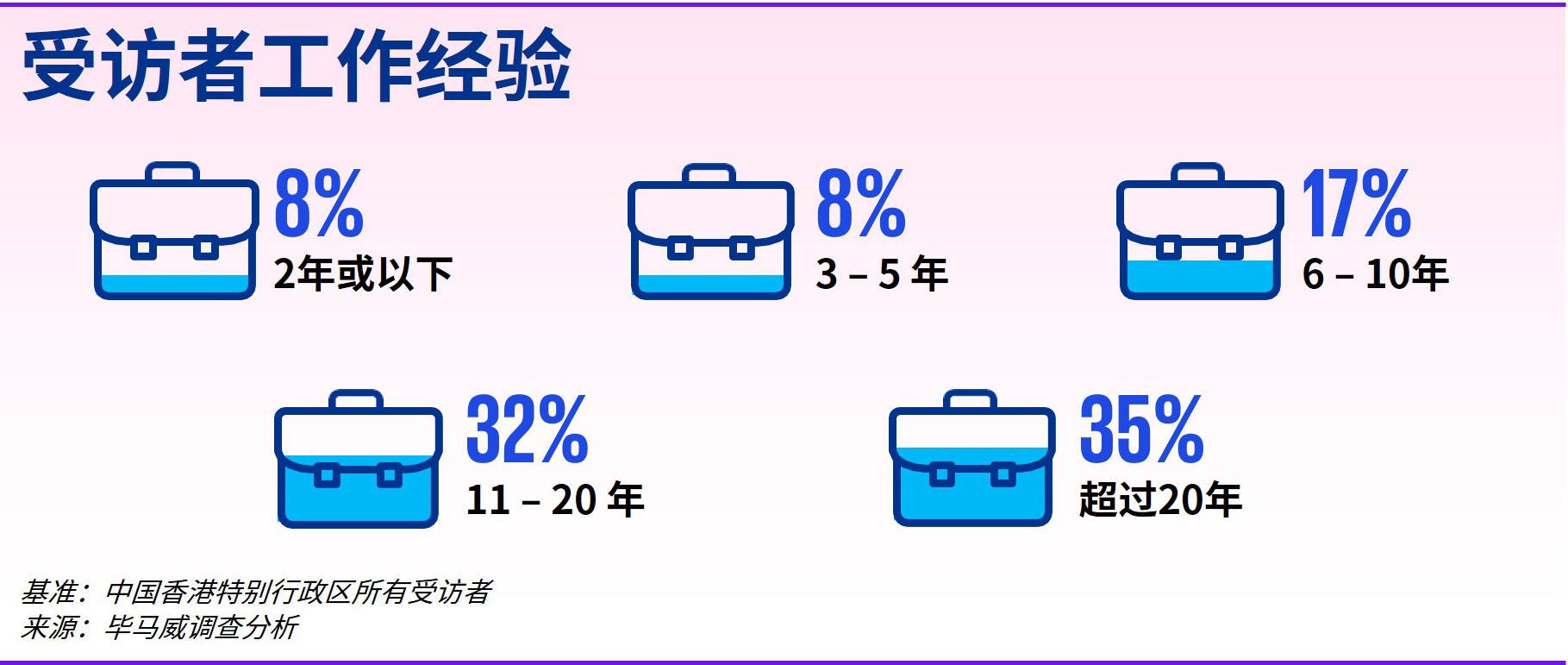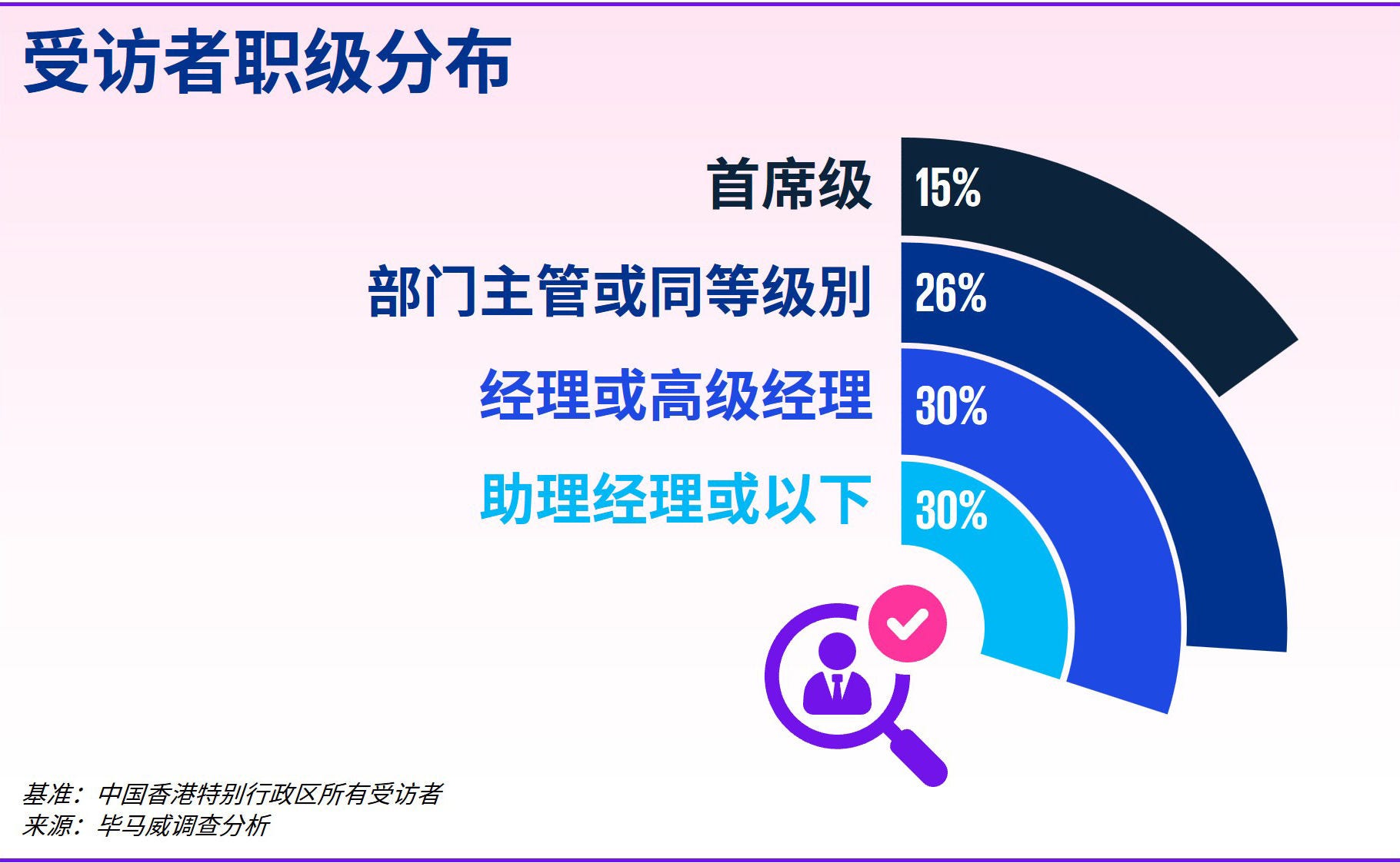 受访者代表来自多个行业的企业,当中60%的受访者组织总部设在中国香港。 在受访者中,41%担任领导职位( 当中15%为首席级,26%为部门主管或同等职位)。