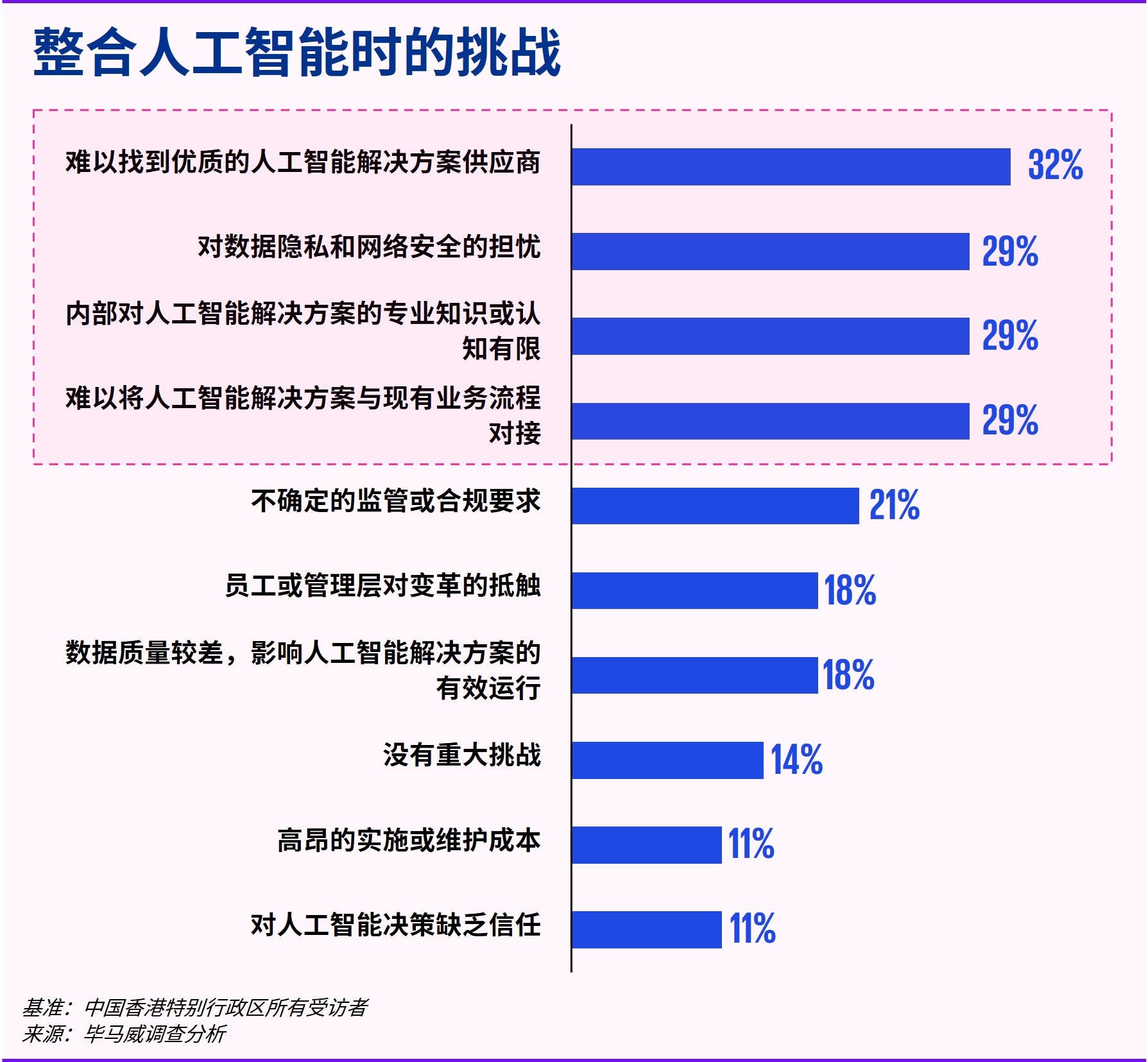 在竞争激烈的市场环境下,识别优质的人工智能解决方案提供商仍然是中国香港企业面临的主要挑战之一。此外,数据隐私与网络安全的担忧、内部对人工智能解决方案的专业知识受限,以及如何将人工智能与现有业务流程有效对齐,也都是企业关注的重点问题。