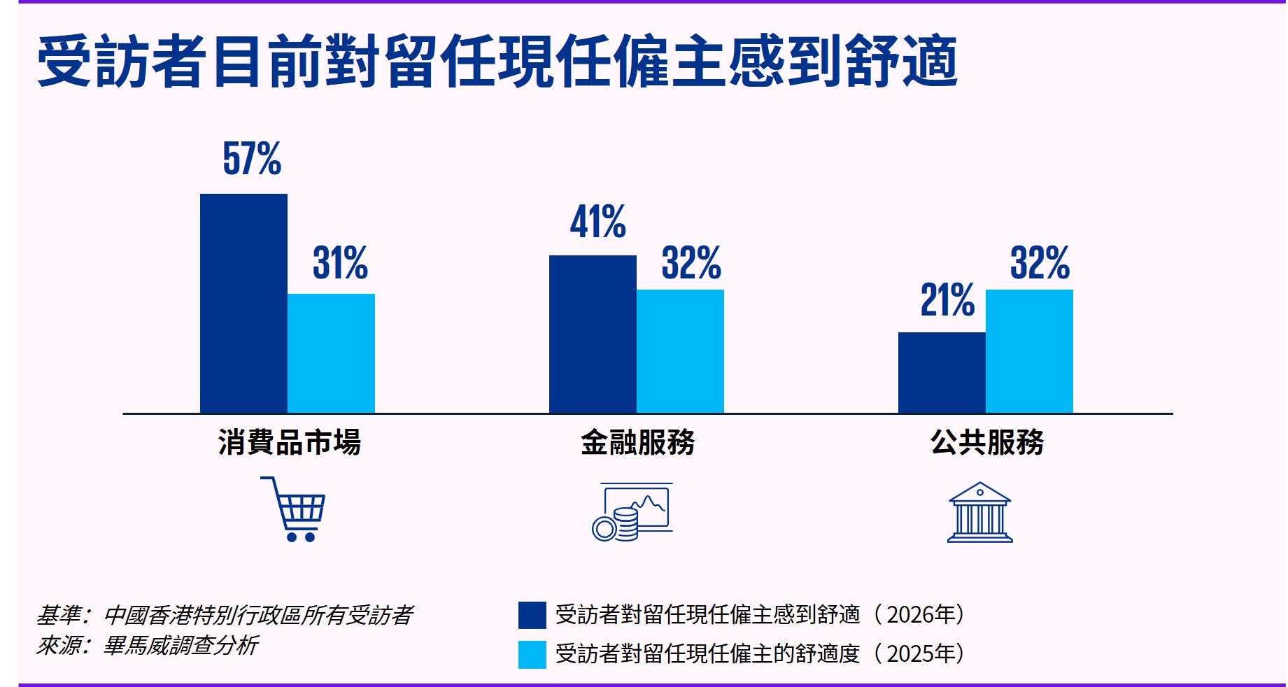 總體來看,36%的受訪者表示願意繼續為現任僱主工作。消費品市場和金融服務的員工留任的意願均有上升,分別為57%和41%;而公共服務的留任意願則有所下降,為21%。