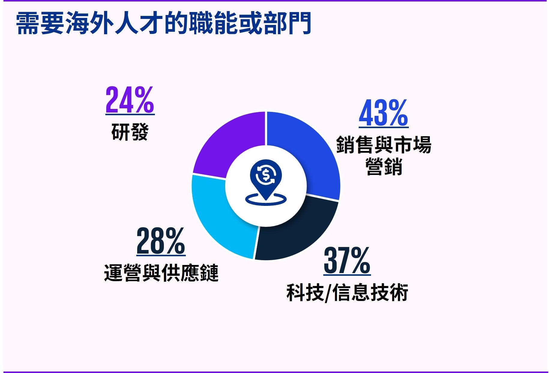 儘管所有人力資源和高管級受訪者在招聘合適人才方面仍面臨挑戰,但認為招聘「極其艱難」的受訪者比例已從2025年的11%降至2026年的僅3%。隨著企業更有策略地從海外引進人才以彌補技能缺口,特別是在銷售與市場營銷、科技/資訊技術、運營與供應鏈以及研發等領域,最嚴峻的困難較以往已明顯緩解。