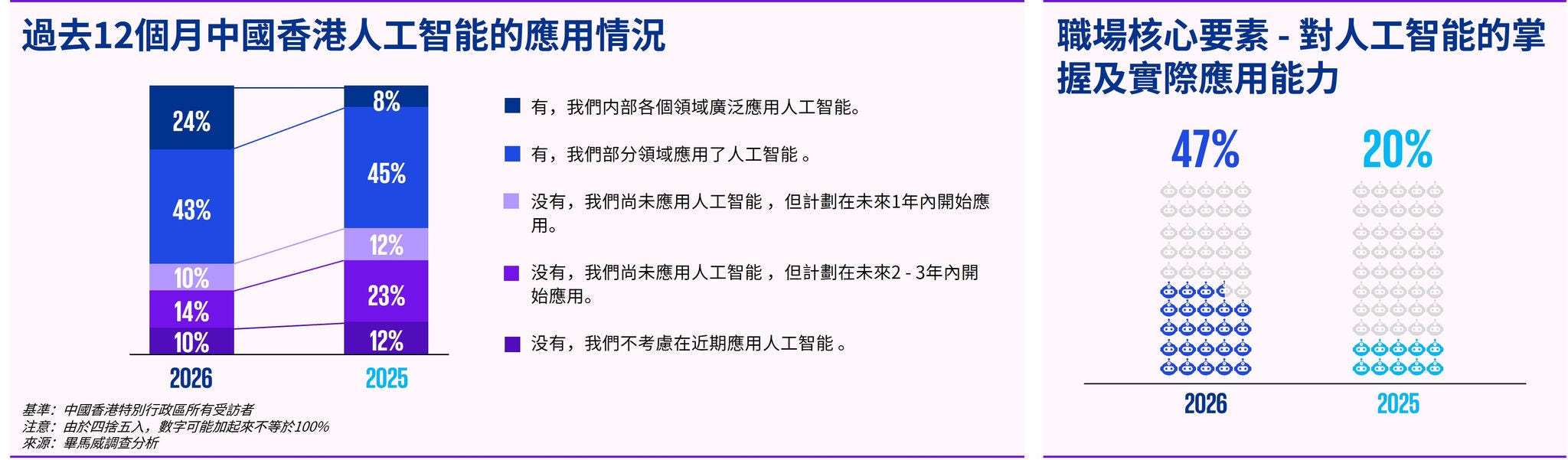 中國香港的人工智能應用正在加速發展,2026年有24%的企業已在廣泛應用人工智能,這一比例是2025年的三倍。因此,掌握並應用人工智能已成為各行業、各層級員工最為關鍵的技能。