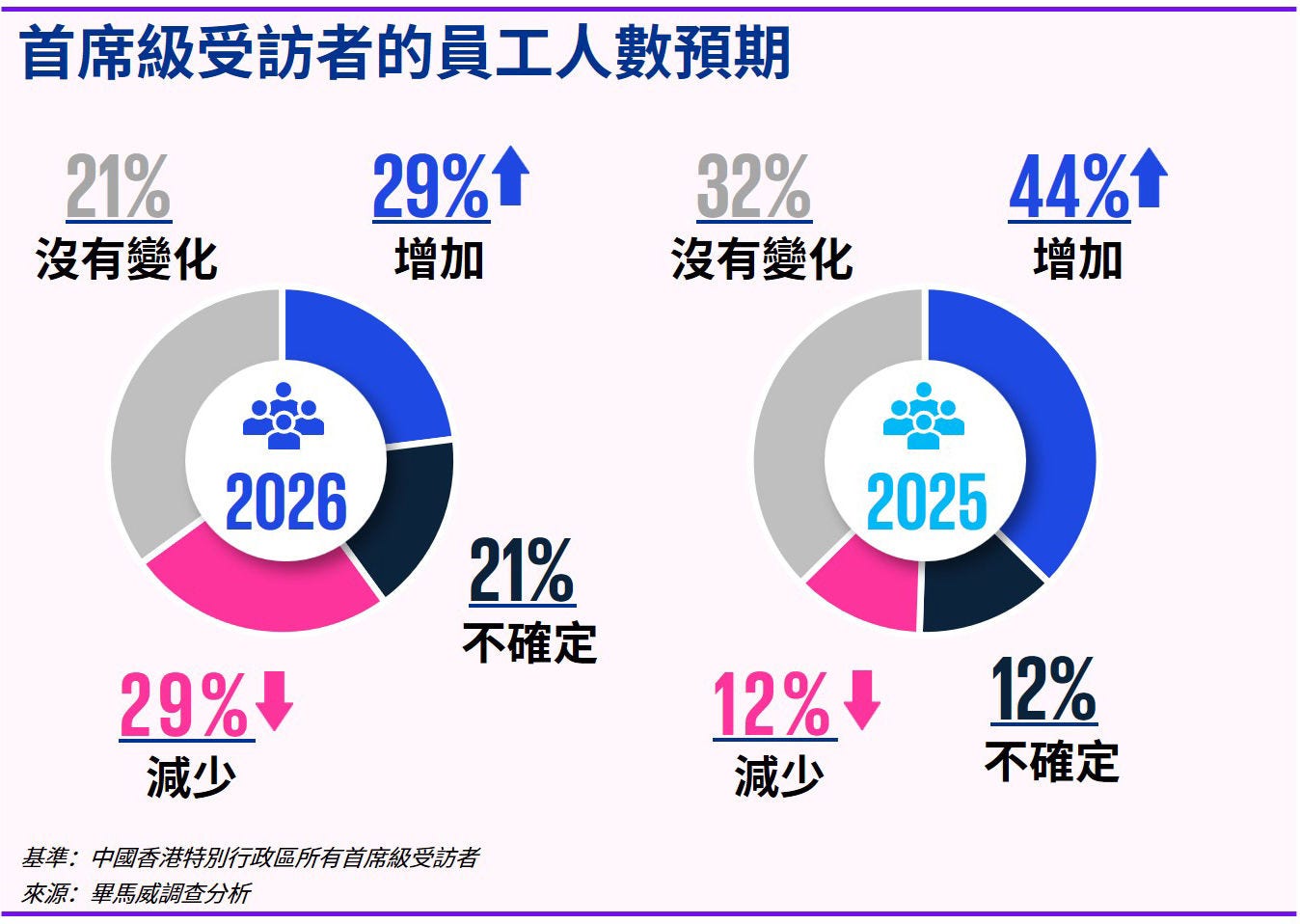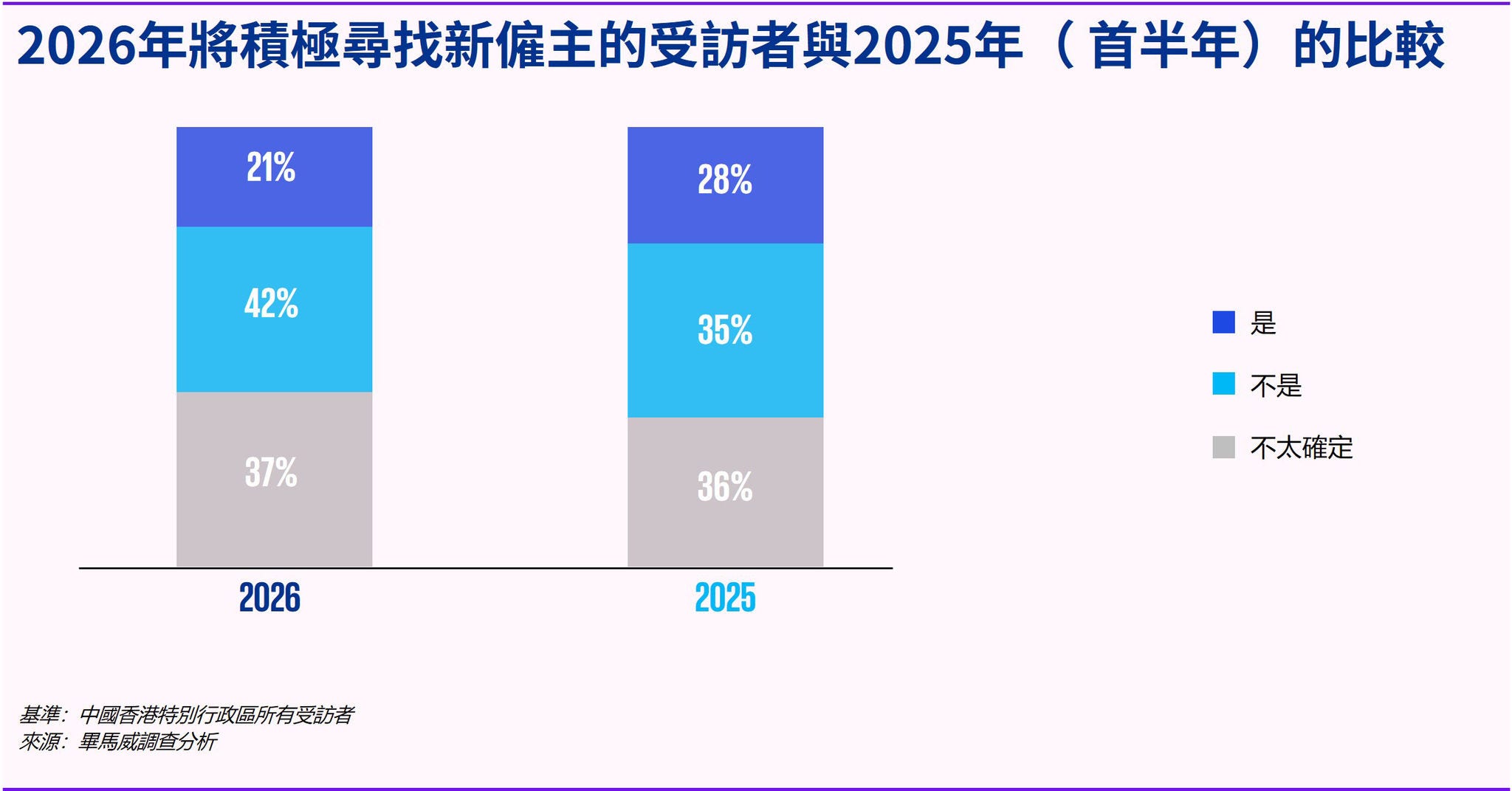 有21%的受訪者表示將考慮在2026年積極尋找新僱主,這一比例較去年的28%有所下降。在留任同一僱主的員工中,有63%獲得了加薪,整體來看,職場人士在尋找新職位時正採取「觀望」態度。