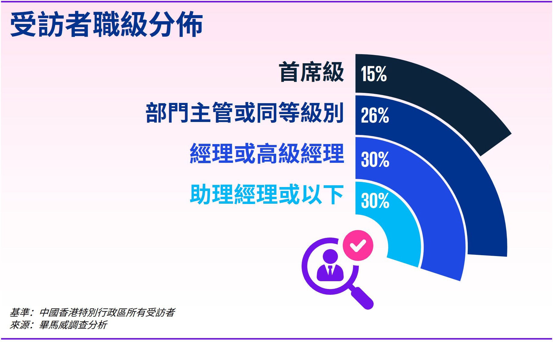 受訪者代表來自多個行業的企業,當中60%的受訪者組織總部設在中國香港。 在受訪者中,41%擔任領導職位( 當中15%為首席級,26%為部門主管或同等職位)。