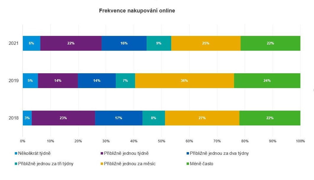 Frekvence nákupů online není příliš vysoká, čtvrtina takto nakupuje jen jednou měsíčně. „Pouze šest procent respondentů nakupuje potraviny online několikrát týdně, dalších 22 procent jednou týdně. Podíl těch, kteří nakupují potraviny online jenom příležitostně, párkrát za rok, se téměř nemění a zůstává mezi 22 a 24 procenty,“ dodala Štegová.