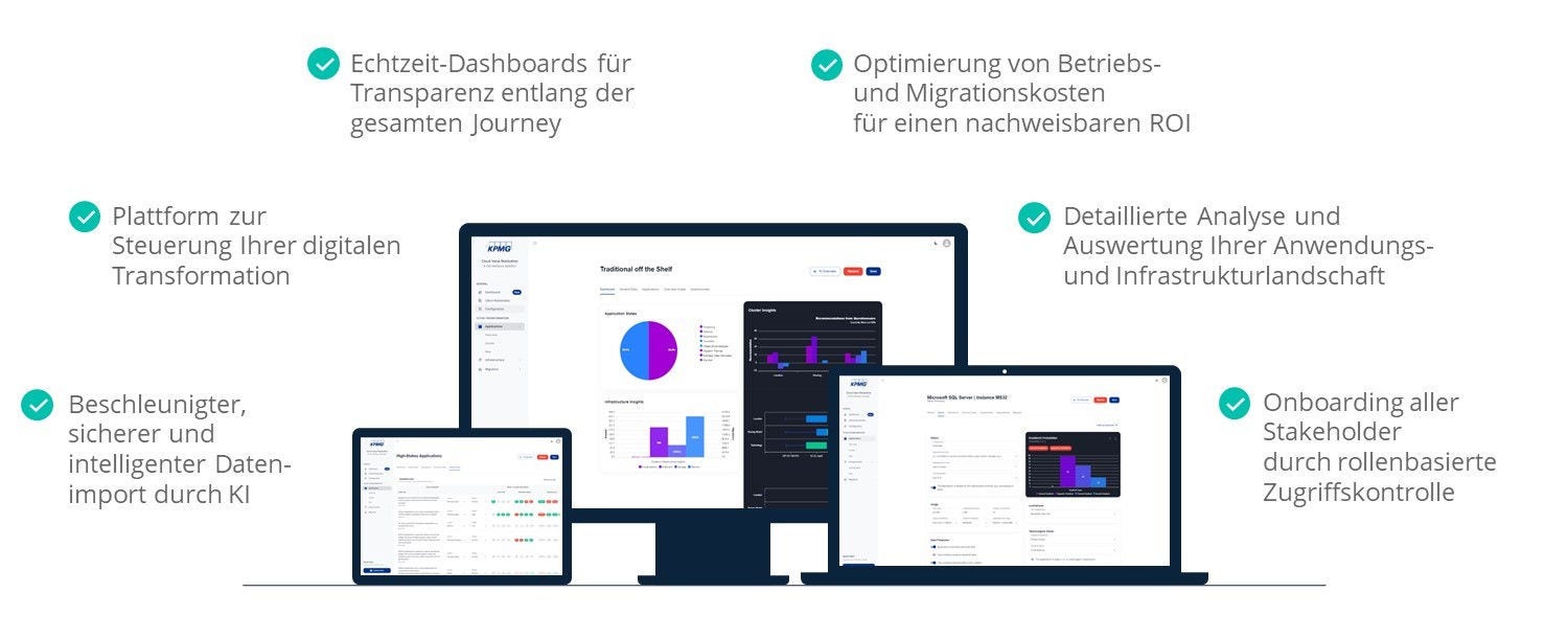 Unsere Plattform ermittelt den schnellsten, effizientesten und sichersten Weg, Ihre Applikationslandschaft in die Cloud zu migrieren und begleitet Sie entlang der gesamten Cloud-Journey durch automatisierte Prozesse.