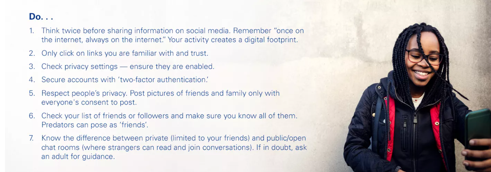 Protecting identities and passwords — while remaining aware and cautious about social media ‘threats’ — is integral to safe and happy social media activity. Understanding the difference between what’s private and what’s public for anyone to view online is crucial as internet activity leaves a permanent trail that represents your ‘digital footprint’. Keep safety, security and smart social media habits top of mind at all times. Read on for additional related content that parents and guardians can review together with their children to help keep them safe and happy while interacting online.