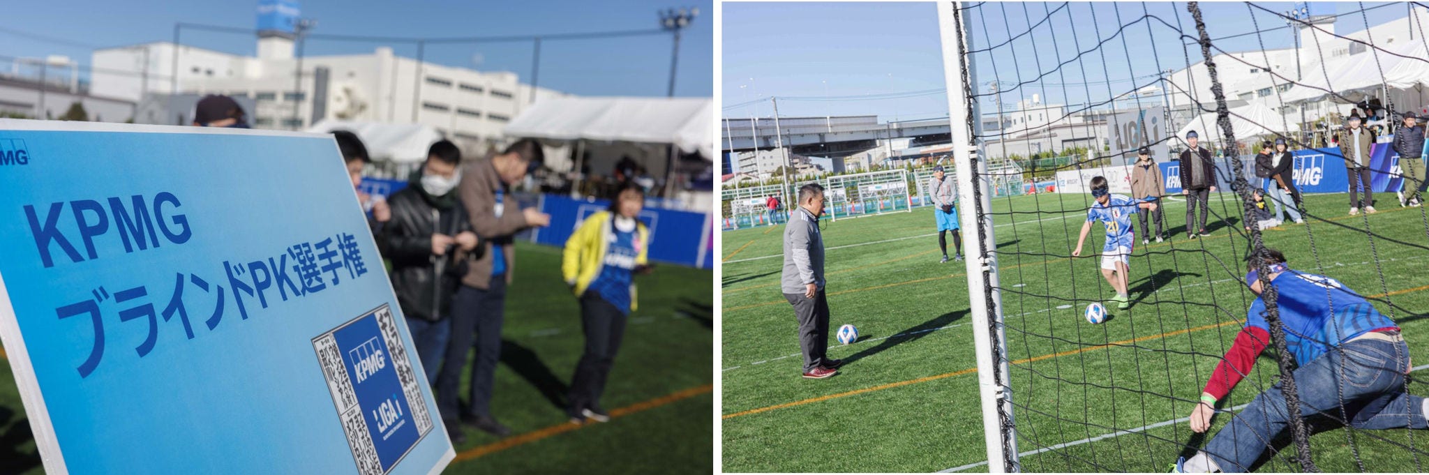 また、KPMGジャパンのIDE(Inclusion, Diversity and Equity)の醸成を目的に、大会当日の、第1試合と第2試合の間に、メインピッチでブラインドPK戦を開催し、KPMGジャパンの職員と家族がブラインドサッカーを通じたコミュニケーションワークを体験しました。