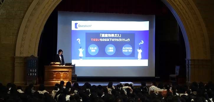 専門領域のサステナビリティから、温室効果ガスに関するクイズを出したパートでは、ちょうど授業でESGがテーマとして取り上げられたばかりだったこともあり、生徒も先生も積極的にご参加いただき、たいへん盛り上がりました。