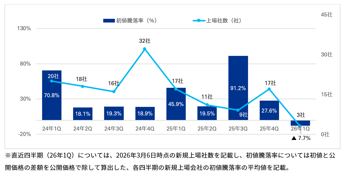 東証スタンダードに1社、東証グロースに1社の合計2社が新規上場しました。なお、2026年に新規上場した3社すべての初値は公開価格を下回り、投資家のIPO人気の低下が懸念されます。