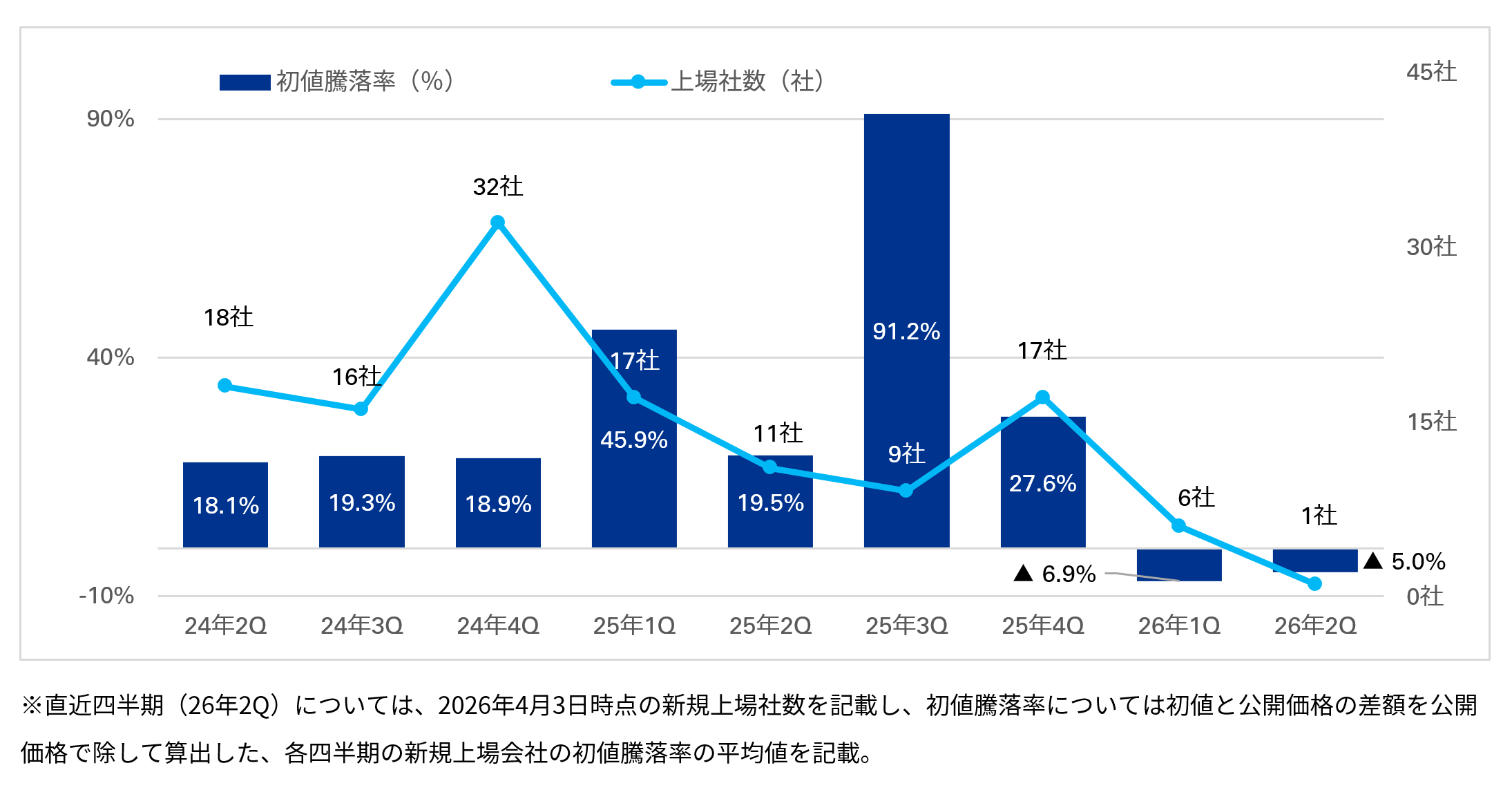 東証グロースに4社が新規上場しました。なお、2026年に上場した7社すべての初値は公開価格を下回り、投資家のIPO人気の低下が懸念されます。
