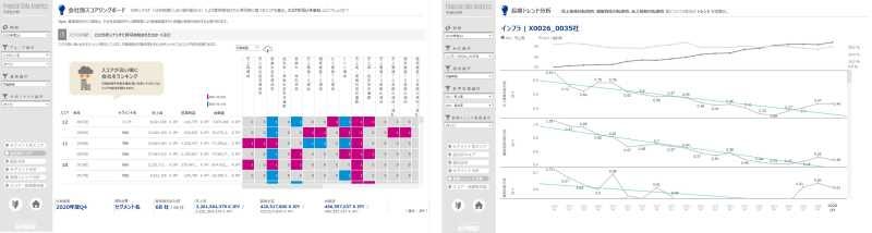 - 可視化処理:勘定科目の増減分析や中長期の傾向分析などの基本情報およびリスク分析シナリオによる異常兆候検知結果を、変化が把握できるように可視化します。