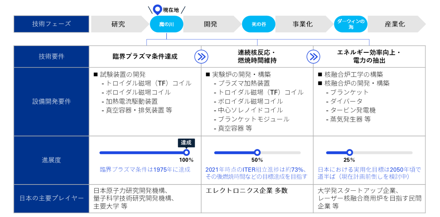核融合発電の事業化に向けては、研究から開発にシフトする”魔の川”を超える必要がある。3つの技術課題をクリアするためには、臨界プラズマ条件達成、連続核反応・燃焼時間維持、エネルギー効率向上・電力の抽出と段階的に技術要件を満たす必要がある。このうち最初の臨界プラズマ条件は達成しており、残る連続核反応・燃焼時間維持とエネルギー効率向上・電力の抽出が当座の目標となる。