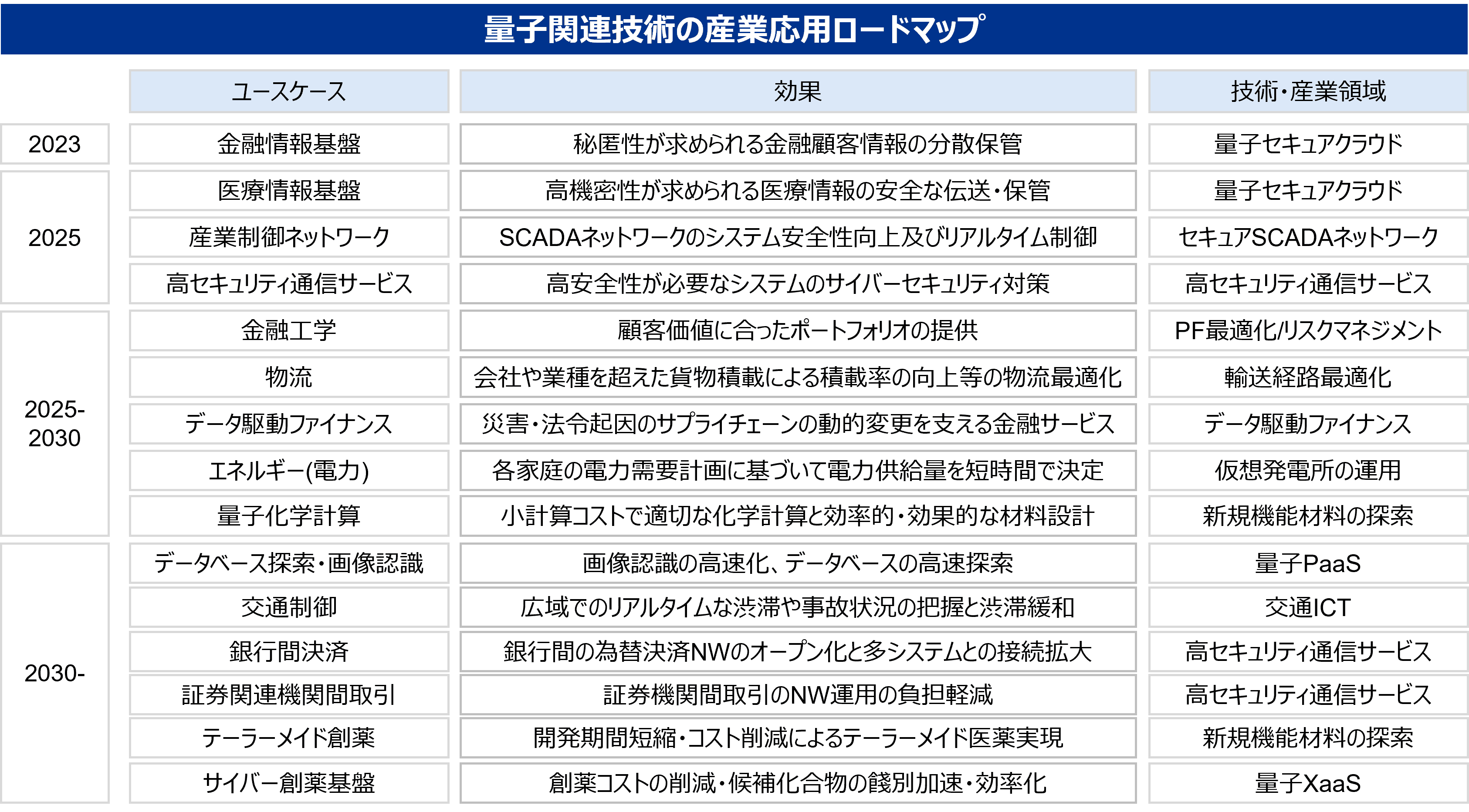 多くの日本企業は、量子コンピュータのハード・ソフトウェアへの事業参入というより、量子コンピュータをどのように活用するか、の検討を始めるタイミングに来ている。量子関連技術の産業応用ロードマップが示されているが、各ユースケースにおいて自社の活用用途の調査から始めるといいだろう。特に金融・製薬・素材・物流・製造といった産業は、量子コンピュータの活用が将来的な競争力に直結する可能性がある。ハードウェア、ソフトウェアの企業やスタートアップとの連携を模索し、先行投資も視野に実践的な取り組みを図ってはどうだろうか。