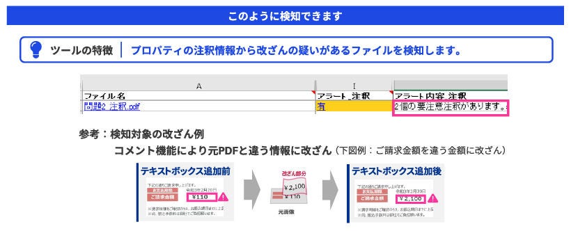 この技術を応用することで、例えばPDF上のコメント機能などを使い、既存の情報(数値や日付、取引先名など)を上書きした改ざん(図1)の検知に有効な可能性があります。改ざんで利用されたコメント機能のテキストボックスと、元々あった記載内容や記載場所の比較を通じて、変更されたという痕跡を発見できる可能性があります。
