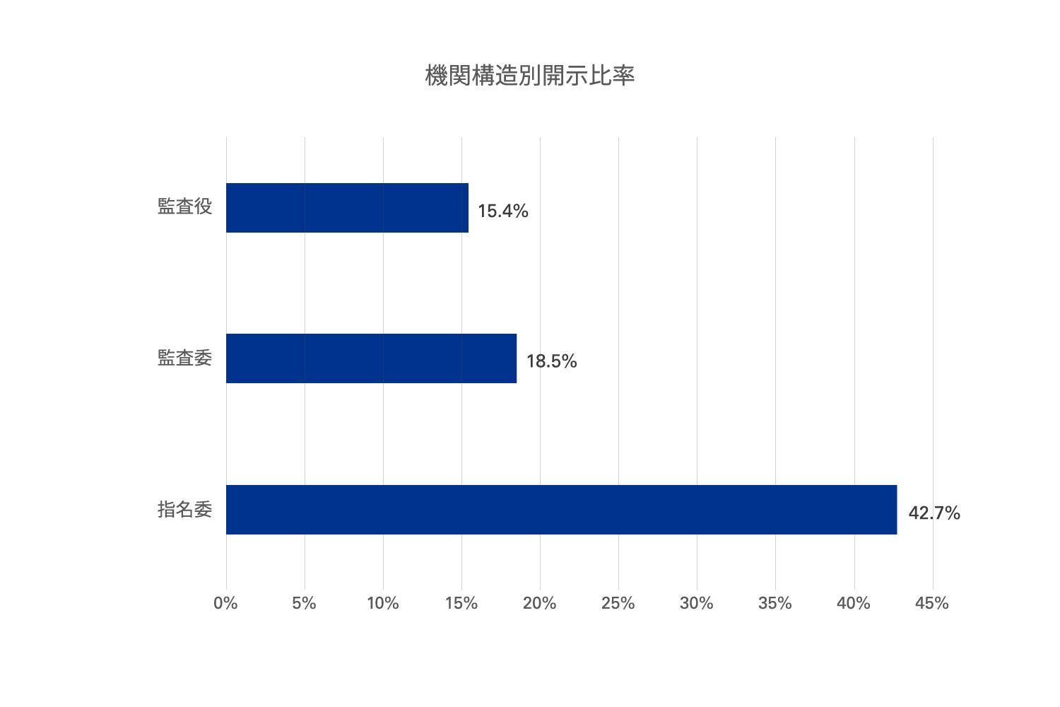 一般に、取締役会の監督機能は、監査役会設置会社→監査等委員会設置会社→指名委員会等設置会社の順で強まるといわれています。ここでは、この機関構造に着目して開示比率を分析しています。実際の開示比率もこの順で高まることが確認できました。(監査役設置会社:15.4%、監査等委員会設置会社:18.5%、指名委員会設置会社:42.7%)。取締役会の監督機能に重きを置いている企業ほど、開示に前向きであるといえます。