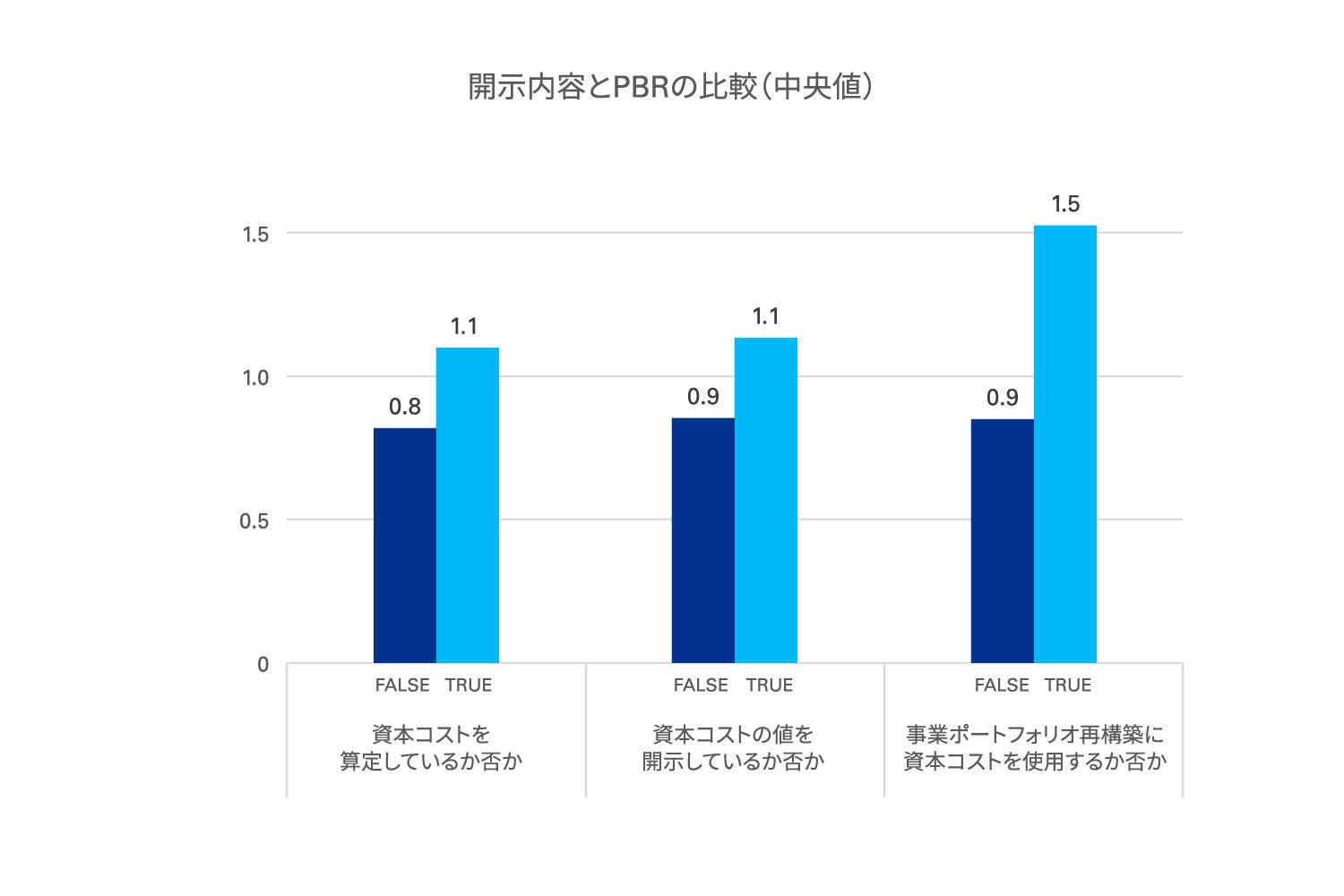 総合して、資本コストの算定に言及している企業のPBRはそうでない企業のPBRより高い傾向が見られました。さらに、資本コストを単に算定していると言及している企業より、値を開示している企業の方がPBRは高く、さらに、資本コストを事業ポートフォリオの再編に活用しているとする企業のPBRはより一層高水準であることがわかりました。