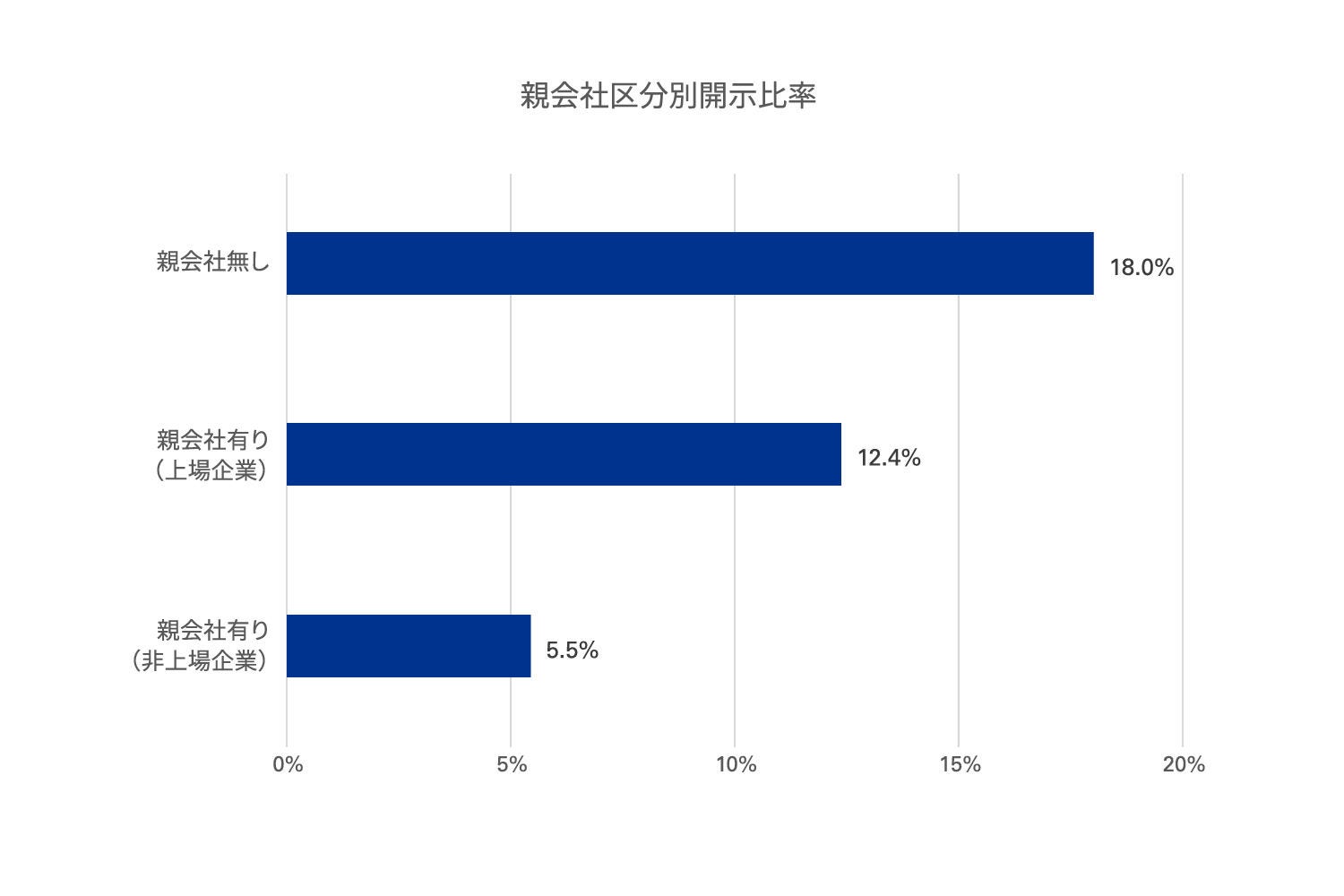 まず企業の所有構造として、親会社の有無(存在する場合、上場非上場の別)に分けて、開示比率を分析しています。親会社が存在しない場合の開示比率は18.0%、上場親会社が存在する場合の開示比率は12.4%となりました。一方、非上場の親会社が存在する場合の開示比率は5.5%に留まっています。