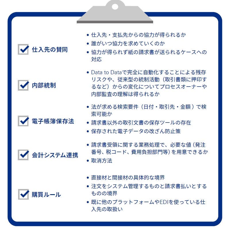 たとえば、前項で取り上げた請求書プラットフォームで言えば、何よりもまず支払先の賛同を得る必要があります。もし、支払先が請求書の発行に郵送やPDFファイル、あるいは独自のプラットフォームを使用していたら、支払先は新たに自社が指定する請求書プラットフォームに請求情報を入力することになります。つまり、可能な限り多くの仕入先から賛同を得られなければ、デジタル化のメリットを享受することはできないのです。また、このようにして請求情報からData to Dataで仕訳作成までを自動化したとして、これまで入力内容の確認や承認印を押捺していた内部統制をどのように整備しなおすかという論点も考えられます。