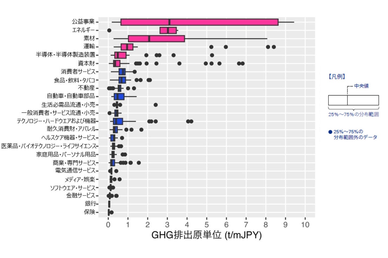 図表2の棒グラフのボックスは各産業のデータの分布の25%から75%を表しており、ボックス内の線は中央値を表しています。単一点はボックス外のデータを示しています。図表2の分布をみると、GHG排出原単位の中央値が1 t/mJPYを超過している産業グループは公益事業、エネルギー、素材の3つであることがわかります。