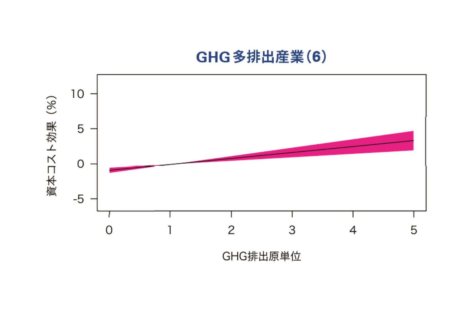 この分析結果は、6大排出グループにおいては、GHG排出原単位の水準が高いほど、株主資本コストの水準も高くなることを示しています。さらに、このデータは、GHG排出原単位と株主資本コストの関係がほぼ線形であることも裏付けています。この関係に則れば、GHG排出原単位を1 t /mJPY下げると、平均して資本コストは0.75%低下することがわかります。