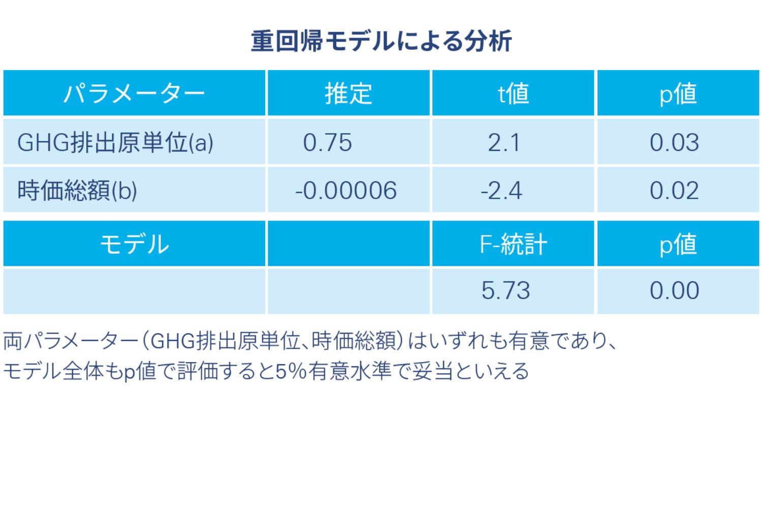 分析の結果、GHG排出原単位と株主資本コストの増加率はほぼ線形であることがわかりました。この結果を踏まえ、線形モデルが本分析を進めるうえで適切であると判断し、より詳細に分析するために重回帰モデルを採用しました。重回帰モデルを使ったGHG排出量と資本コストの線形関係は以下のようになります。