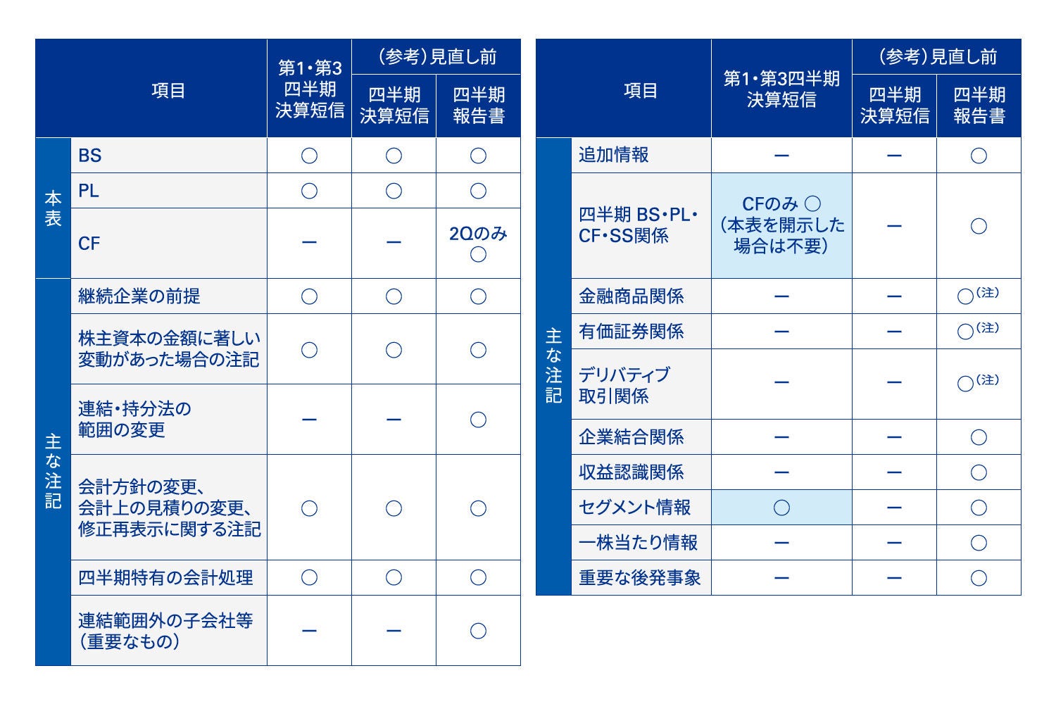第2四半期・通期決算短信は見直し前の取扱いが維持される。また、半期報告書の開示内容や開示タイミングは、改正前の第2四半期報告書と同程度である。