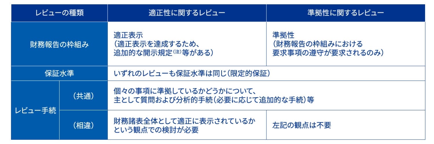 また、採用する財務報告の枠組みに応じて、図表3のとおり、保証水準は同じではあるものの、それぞれ異なる種類のレビューが実施されることになります。