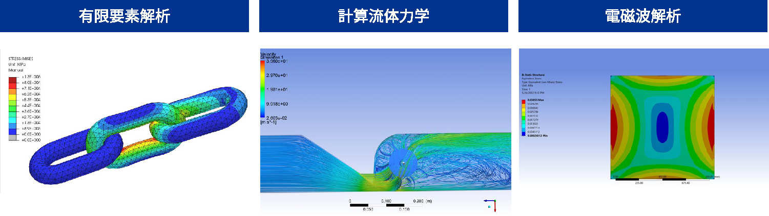 これら3つの要素技術をベースに、シミュレーションソフトウェアとして、CAE(Computer-aided engineering:コンピューター支援エンジニアリング)が展開されている。CAEは、設計の変更が製品の実際の性能に与える影響を予測し、コンポーネントや部品の性能の頑強性(ロバスト)を確保し、性能強化に寄与する。