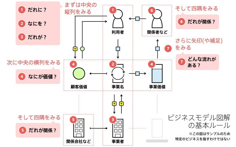 近藤氏:ビジネスモデルはそれぞれとても複雑で、いまだに全貌を解き明かせているわけではありません。しかし、「誰が」「どんな事業を」「誰に対してやるのか」という構成は普遍的です。そこで、ビジネスモデル図解のフォーマットを3段構造にし、上の段を顧客、真ん中の段を事業、下の段を事業者としています。この3×3=9つのマスはそれぞれに意味がありますが、1つずつ見るのではなく全体のバランスを見る必要があります。たとえば、商品と顧客、自社のリソースと商品というようにマス同士の比較を通して、そのビジネスモデルがきちんと成立するのかを見ていきます。あの9マスで、そのための最低限の情報が整理できるようになっています。
