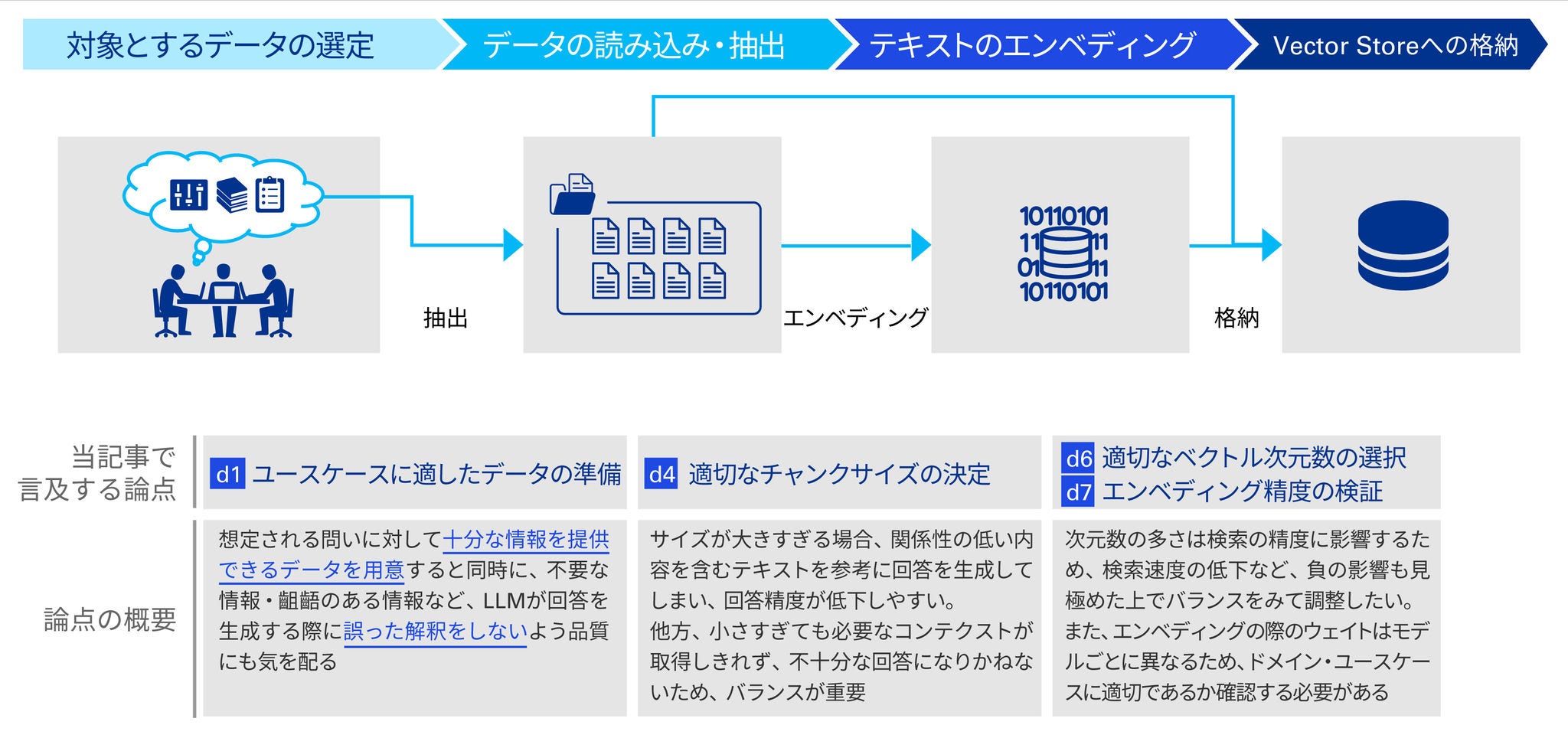 ※かっこ内の論点IDは本記事のダウンロード資料(rag-ai-03.pdf)と同一である。本記事では主要な論点のみに触れ、詳細はダウンロード資料にて補足しているため、併せて参照頂きたい。なお、「d」はデータ準備の論点、「a」はアプリケーションの論点を意味する。