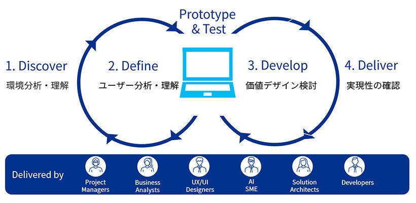 この推進方法は、人間に焦点を当てた設計を可能にする方法論であり、ユーザー中心のサービス設計を目指す仕組みになっています。これはアジャイル開発方法論と組み合わせが可能であり、さまざまな利害関係者と共にプロトタイプを作成・検証し、実用的なサービスを検討するための反復的なサイクルを回すことを目的としています。