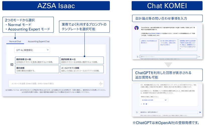 AZSA Isaac(汎用的なチャットボット)/Chat KOMEI(会計・監査専用のチャットボット)
