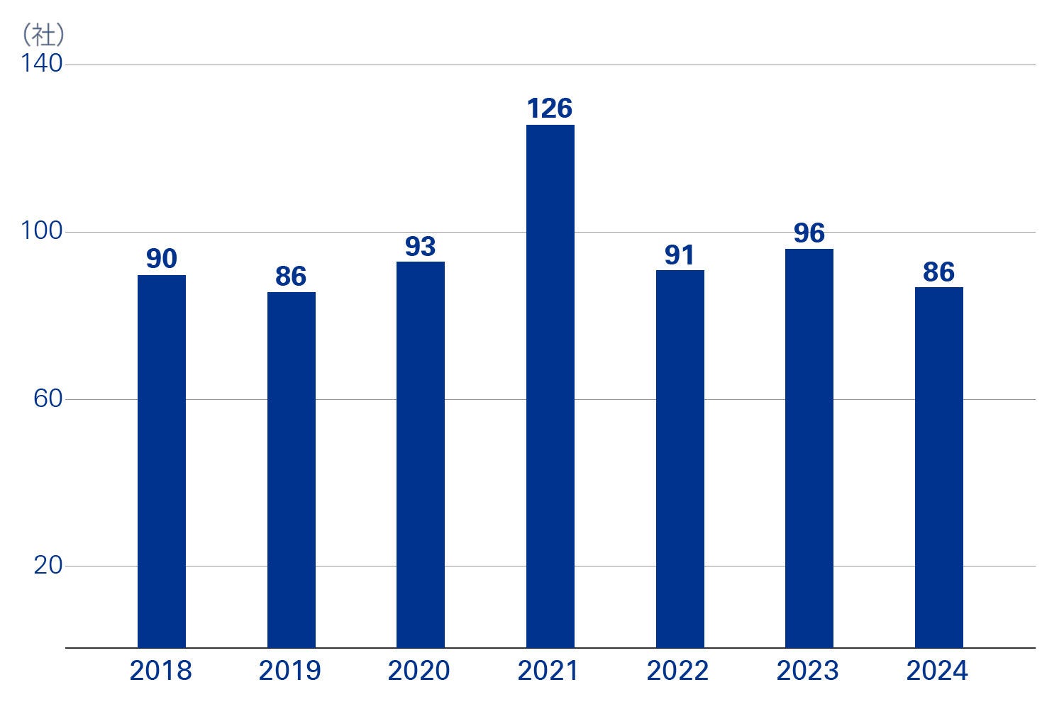 日本の株式市場では日経平均株価およびTOPIXが年初より堅調に推移する一方で、東証グロース250指数(以下、「グロース250指数」という)は2020年をピークに安値水準で推移しています。そのようななか、国内における新規上場社数は2022年以降では90社前後で安定しています(TOKYO PRO Marketへの上場社数を除く)。2024年においては、前年比10社減の86社の見込みです(図表1参照)。
