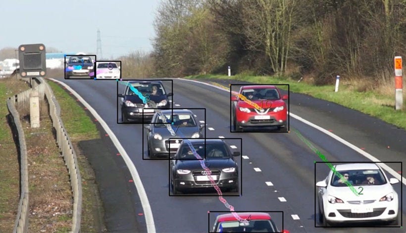 図3:高速道路での自動車[6]のMOT例。各バウンディングボックスの中心点を自動車の軌跡として描画。