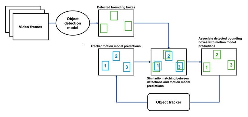 図4:tracking-by-detectionの処理フロー。ビデオフレームを入力として、物体検出モデルを用いて所望の物体をバウンディングボックス(緑枠)で検出します。各バウンディングボックスは、過去の追跡情報から予測したバウンディングボックス(青枠)との類似度から紐付けされる。