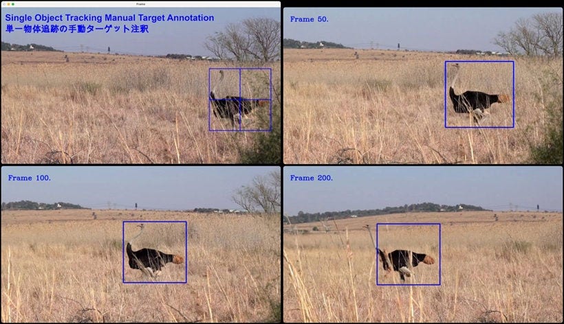 図2:SOTを用いたダチョウ[5]の追跡例。左上隅の最初のフレームで、手動でダチョウをバウンディングボックスでアノテーションすると、ダチョウが後続の各フレーム50(右上)、100(左下)、200(右下)で移動しているところを追跡できます。