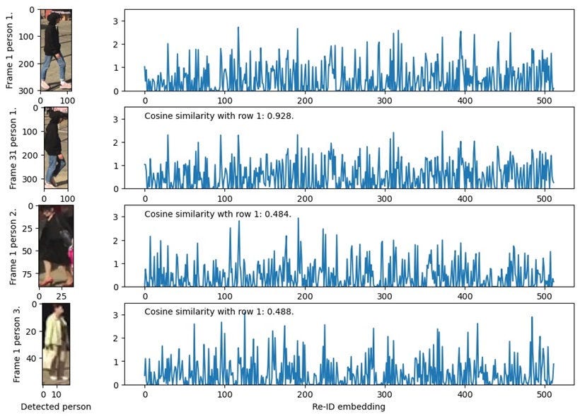 embeddingの例を図5に示します。1段目が追跡対象人物の映像とembeddingです。2段目の異なる時間帯で撮影された同一人物のembeddingとの類似度は0.928と高く、それに対して3、4段目の異なる人物のembeddingとの類似度は0.484、0.488と低いことが確認できます。このように視覚的な情報を特徴量化したembeddingの類似度を比較することによって、一度見失った人の追跡を再開することが可能となります。実際には、embeddingは撮影時間帯等による明るさや人の向いている向きの違いによる視覚的変化による影響を受けるため、一定時間で累積したembeddingを平均処理したり、人の姿勢を推定した結果と組み合わせるなどの工夫をしたりします。
