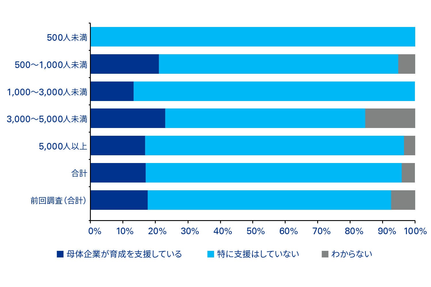 育成について母体企業が支援している企業は2割に満たず、本人の努力に委ねられている企業が多くなっています。人材配置や育成、マネジメントの関与など組織的対応の確立が課題といえます(図表1 参照)。