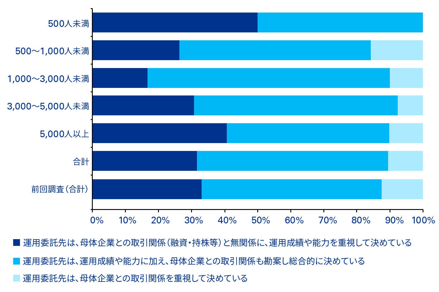 しかしながら、本調査によると、純粋に運用能力だけで委託先を決定している企業は全体の30%程度となっており、母体企業との取引関係が重視される傾向がうかがえます(図表2参照)。先に述べた利益相反管理の意義や趣旨を理解した取組み強化が望まれます。