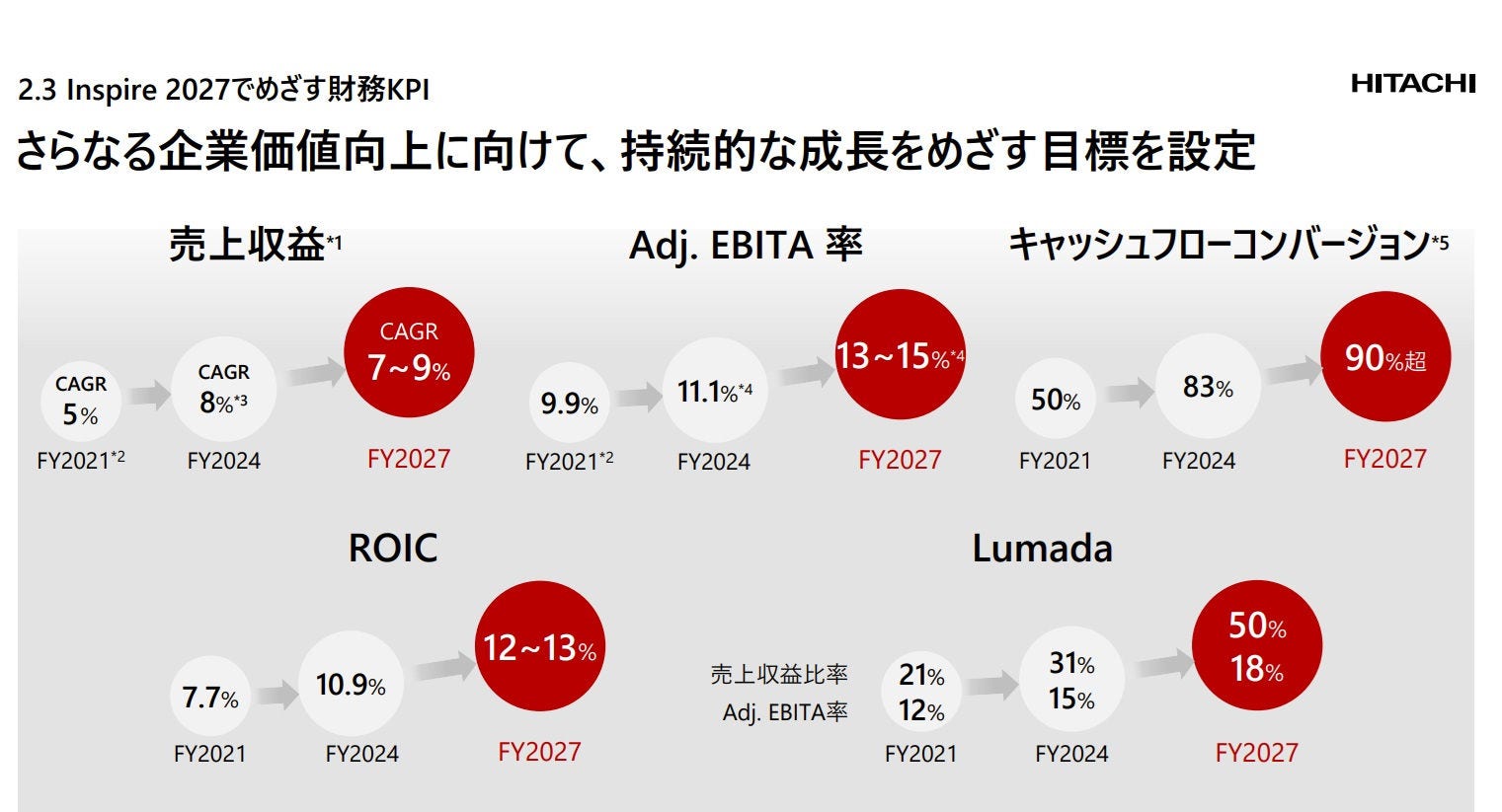 まず「売上成長率」、つまり売上をどの程度伸ばしていくか。次に「Adjusted EBITA」、いわゆる営業利益率です。この2つは、Lumada 3.0※の事業拡大による売上成長と、マージン向上を同時に実現していくという戦略的位置づけです。それに加えて今回、「キャッシュフローコンバージョン」、つまり当期利益とわれわれが定
