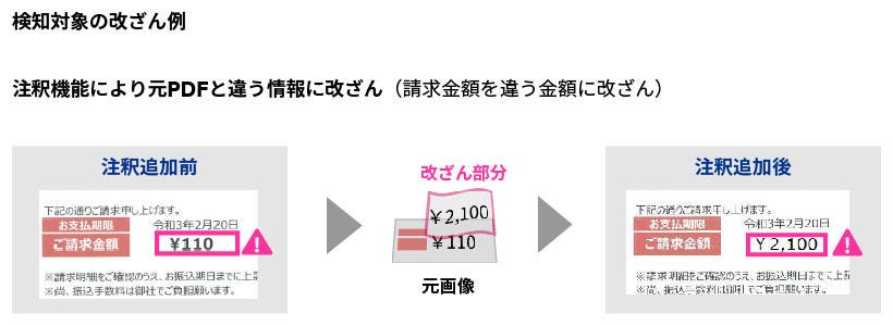 KaizanCheckBot_aiは、見た目だけでなく、PDFの構造を解析し、ファイルの中に含まれる情報もチェックします。たとえば、PDFファイルには「電子署名」や「テキストボックスなどのオブジェクト」などの情報が含まれることがあります。このツールは、「電子署名された後に編集された形跡がある」「不自然な箇所にテキストボックスが配置されている」といった通例でない処理を検知し、監査人に提示します。これにより、改ざんのリスクをより広い視点から検知できます。