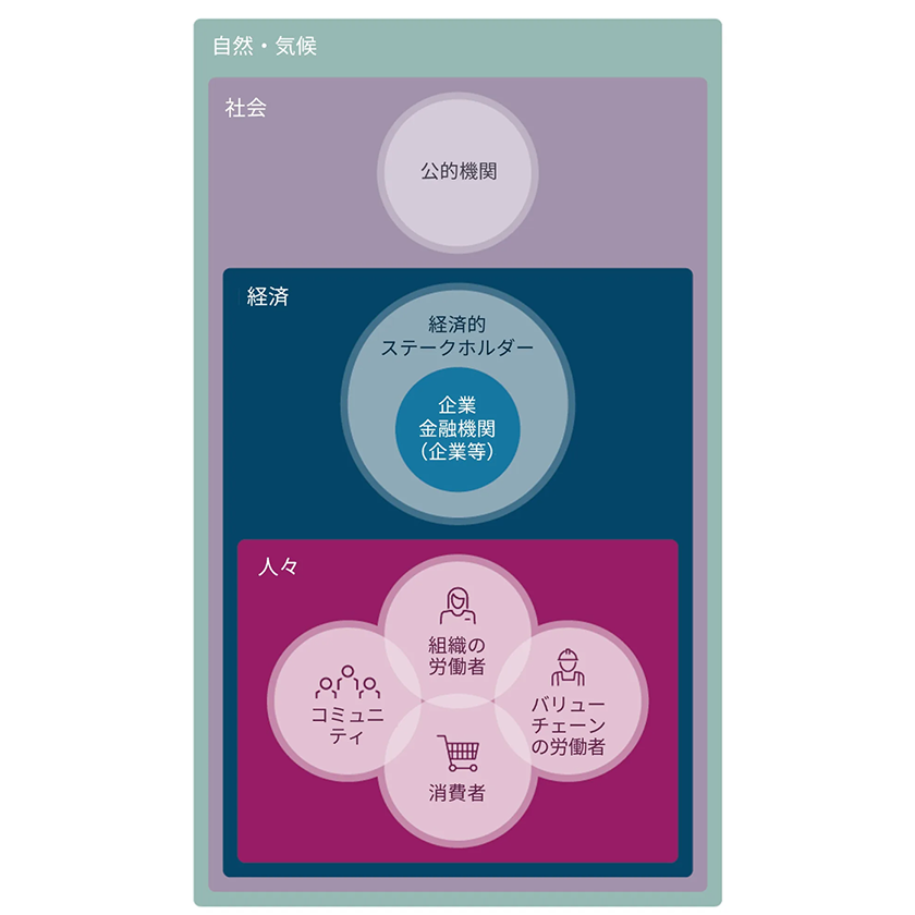 まず、企業や金融機関(以下、「企業等」)と人々の関係性について、人々のカテゴリ(「組織の労働者」「バリューチェーンの労働者(上流・下流の双方を含む)」「消費者とエンドユーザー」「インパクトを受ける人々を含むコミュニティ」)、企業等を含む経済的ステークホルダー、人々や企業等が活動する社会、およびそれらを包含する自然や気候について、定義と基本的な関係性を示しています。