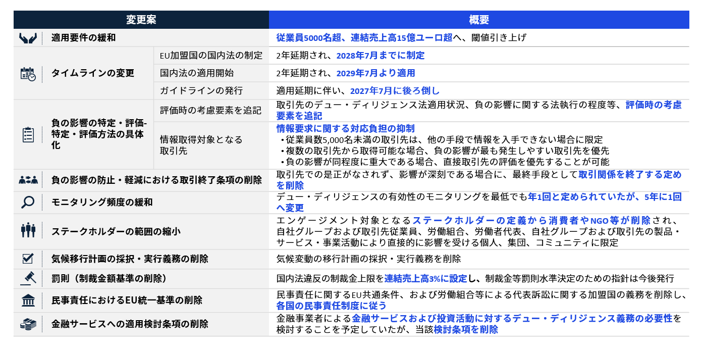 EU の競争力強化を目的として制定された「オムニバス法」により、CSDDD の要請事項が一部緩和され、適用対象企業に対する規制負担の軽減や、中小企業等への義務の波及(いわゆるトリクルダウン)の抑制が図られることとなりました。