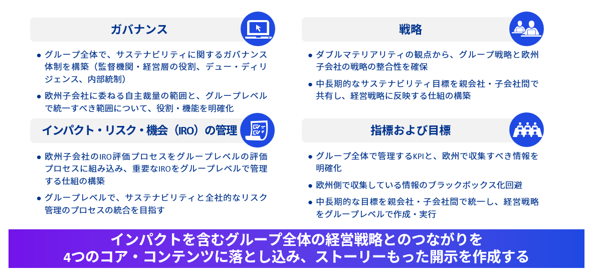今回の改正は、CSRD対応を見直す機会であると同時に、日本企業にとってはSSBJを軸とした開示体制やサステナビリティ情報収集プロセスを見直す判断を促す内容となっています。また、CSRD報告義務のある企業は、ダブルマテリアリティ視点からのインパクトと、SSBJで開示するリスクと機会の関係を整理し、SSBJおよびCSRDのいずれにおいても、インパクト含むグループ全体の経営戦略とのつながりを意識し、ストーリー性のある開示を作成する必要があります。