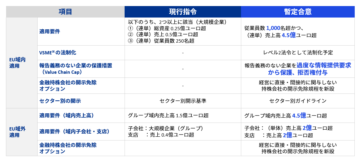 従業員数1,000名超かつ、(連単)売上高4.5億ユーロ超へ適用要件を引き上げており、規模が大きくない企業の報告義務を免除することで、経営資源を事業に集中することを可能にしています。また、報告義務のない企業を報告義務のある企業からの過度な情報提供要求から保護する措置(Value Chain Cap)を設定するとともに、そのような企業のために、CSRDの要件を満たさない中小企業のための開示基準(VSME)を設定し、情報提供の範囲を制限する予定です。